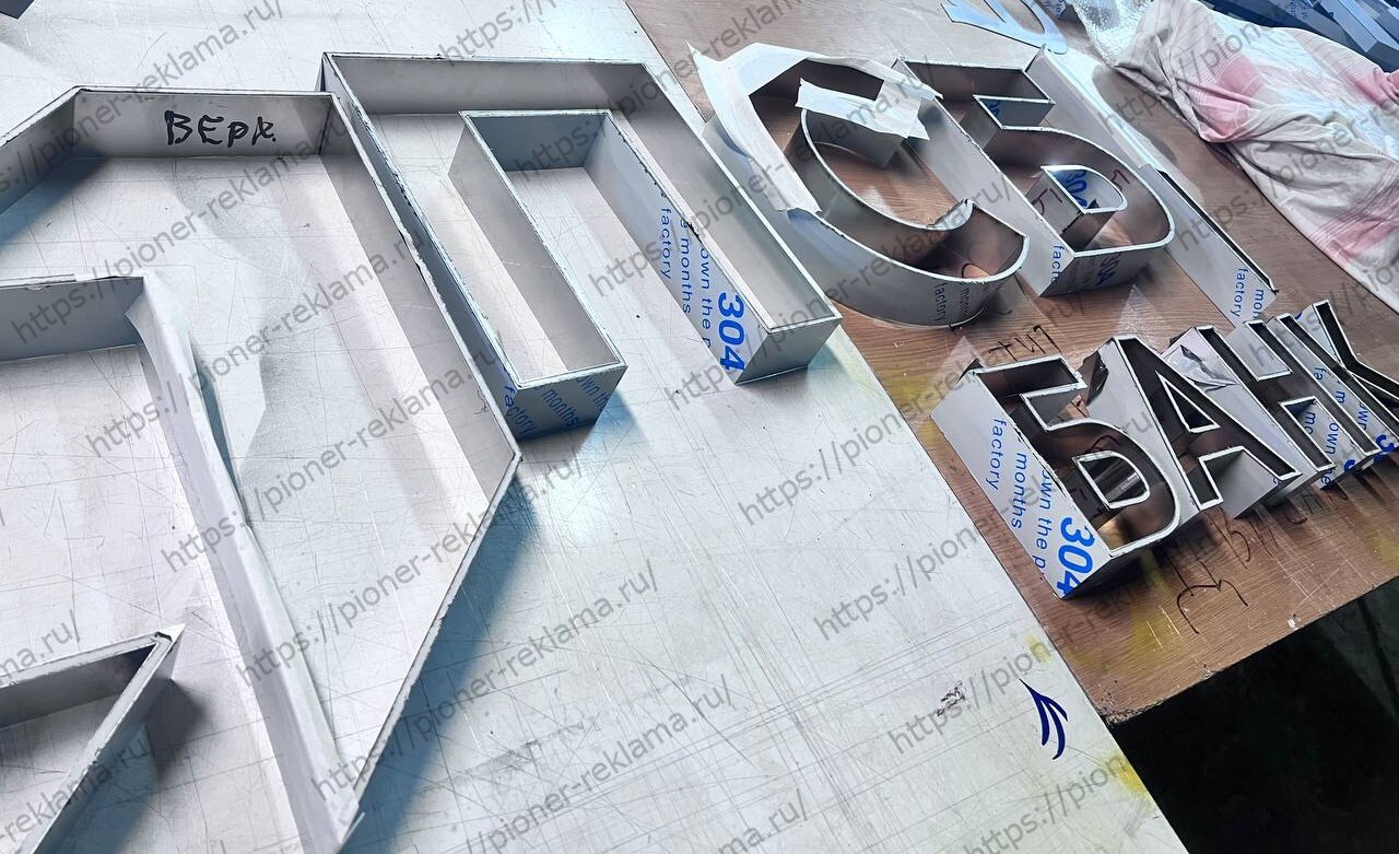 Процесс создания корпусов букв для ПСБ Банк стал демонстрацией наших производственных возможностей. На этапе проектирования каждая буква была смоделирована в 3D с привязкой к фактическим замерам фасада — это позволило точно рассчитать глубину свечения и избежать бликов от соседних зданий. Лазерная резка нержавеющей стали обеспечила точность контура ±0,1 мм — критически важный параметр для стыковки борта и лицевой панели.
