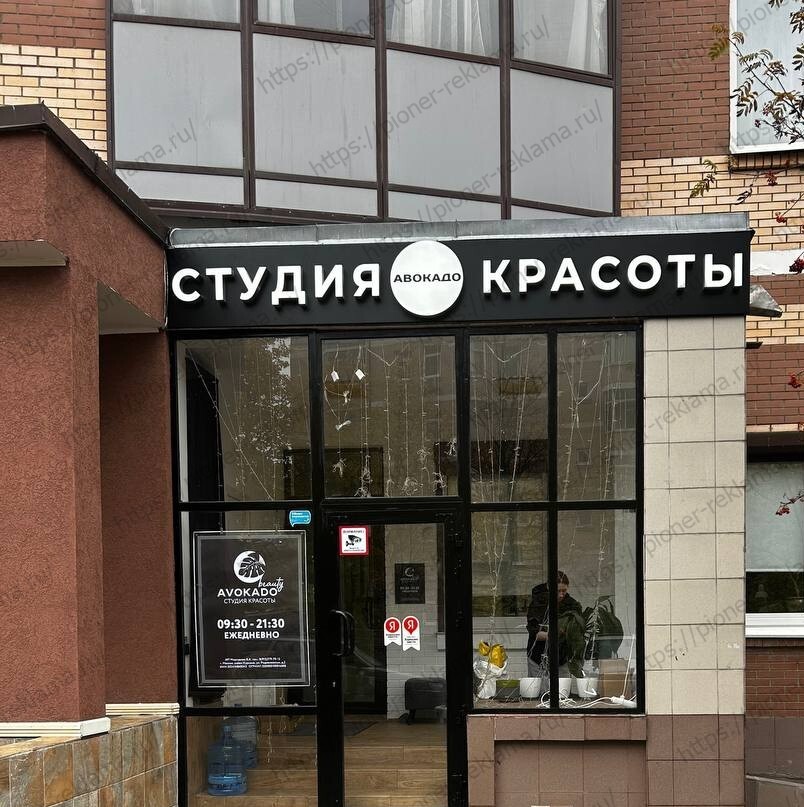 Для beauty-брендов, медицинских центров, аптек и химчисток (например, химчистка «Эталон») мы рекомендуем нейтральный белый свет (4500–5500K). Он ассоциируется с чистотой, стерильностью и свежестью. Теплый свет (2700–3500K) подходит для ресторанов, кофеен, бутиков — он создает уют. Холодный (6000K+) — для техно-брендов, автосервисов, IT-компаний. В «Пионер-Реклама» мы подбираем цветовую температуру под клиента. В случае «АВОКАДО» — нейтральный белый стал идеальным выбором для передачи концепции «чистой красоты».