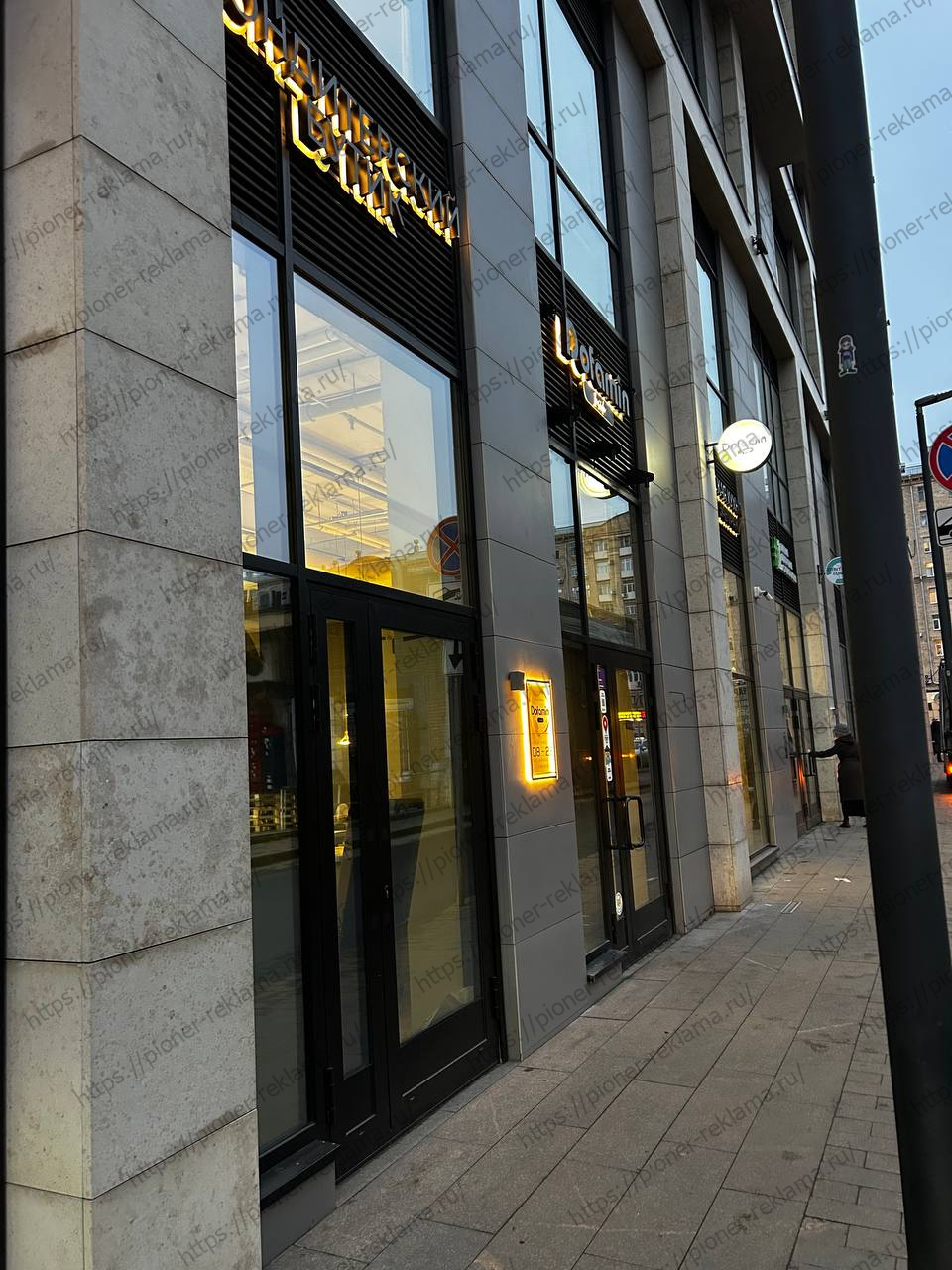 Что мы получили в финале? Двухстороннюю консольную вывеску, которая действительно прекрасна с любого ракурса. Днем она выглядит как элегантная графическая композиция: глубокий черный борт контрастирует с теплыми оттенками лицевой пленки, создавая ощущение премиальности. Вечером конструкция преображается — нейтрально-белое свечение мягко обрамляет название бутика, превращая вывеску в арт-объект, который хочется сфотографировать и сохранить в памяти.